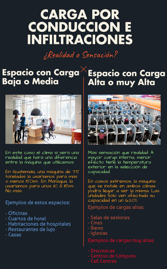 Digamos que una oficina de 150m² en Guatemala, con 26 personas, iluminación promedio, 26 computadores y dos UPS puede ser enfriada con una unidad de 7.5 toneladas térmicas. Dado que el nivel de ocupación es bajo o medio, la carga por conducción en infiltraciones sí es significativa, así que la decisión de acondicionar esta misma oficina en Managua con una unidad de 10 toneladas será una realidad.