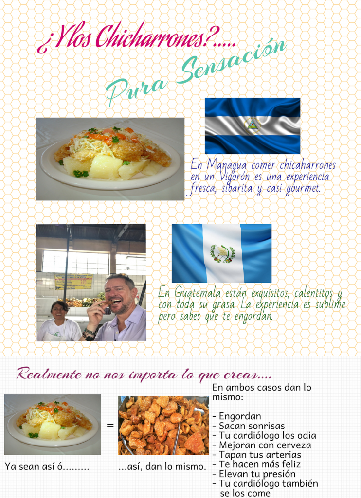 – Tanto en Managua como en Guatemala, los chicharrones están buenísimos. Nos duele igual cuando se terminan y ya no hay más. Y sépase también que aunque en Managua estén envueltos en esa aura de frescura, en ambas ciudades los chicharrones engordan igual.